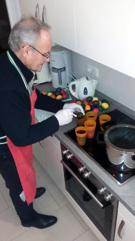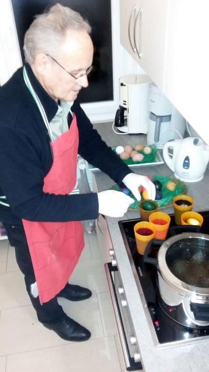 Einige Tage vor seiner Operation am Rücken hat Herr Bösebeck noch die Eier (70 Stück!) in der Küche des Gemeindehauses für das Osterfrühstück gekocht und gefärbt.