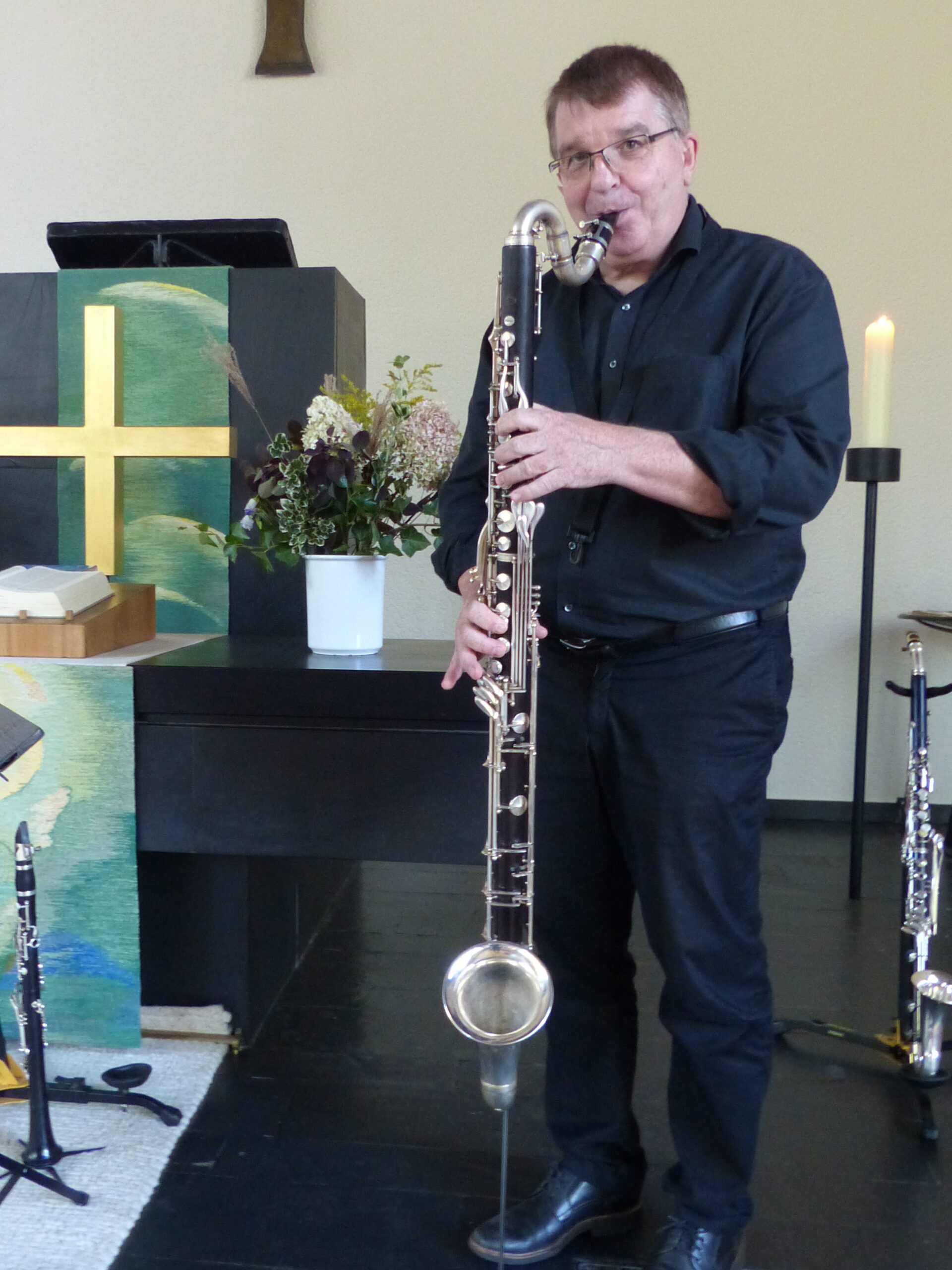 Es gab an diesem frühen Abend in der ev. Kirche aber auch fröhliche Piaf-Chansons wie „La vie en Rose, Milord“. Da strahlte nicht nur die Akkordeon-Spielerin, sondern auch das begeisterte Publikum. Bei der Andacht wurde überaus deutlich, dass Akkordeon-Begleitung einfach zu Paris und zur Piaf, dem „Spatz von Paris“, dazugehört. Die Klänge von Lehnas Instrumenten – er wechselte zwischen Bass-, Alt- und der kleinen C-Klarinette – bildeten die passende Ergänzung zur Musik, die mit den schwarz-weißen Tasten erzeugt wurde.